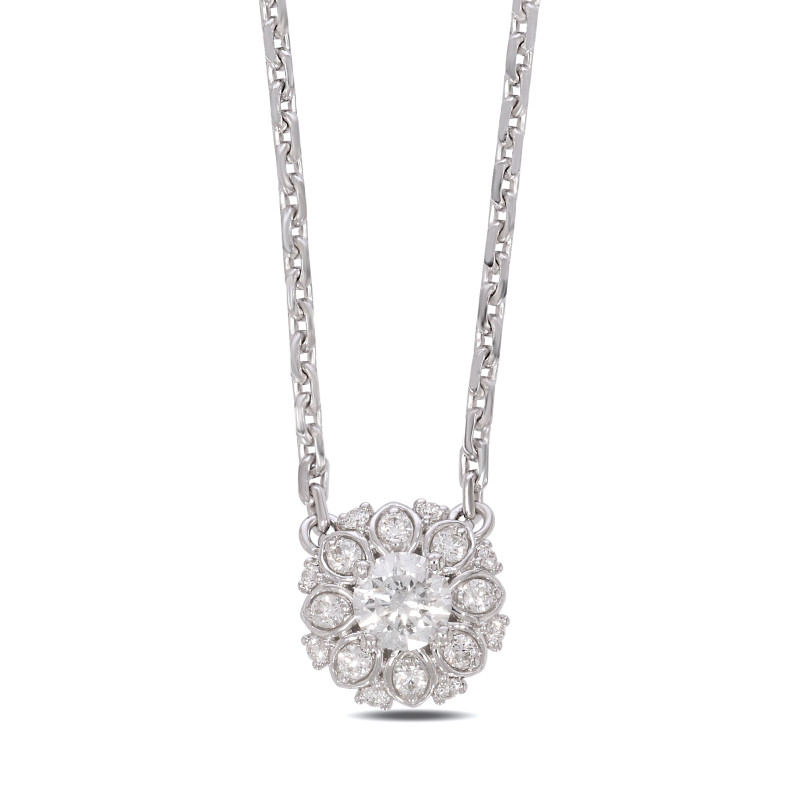 Inspired by the delicate elegance of a blooming flower, this exquisite pendant is crafted in 18kt white gold and adorned with natural diamonds. A brilliant round diamond sits at the heart, encircled by a radiant halo of alternating pear-shaped and round diamonds, creating a dazzling floral motif. Suspended on a sleek chain, it brings timeless charm and luminous sparkle to any look.