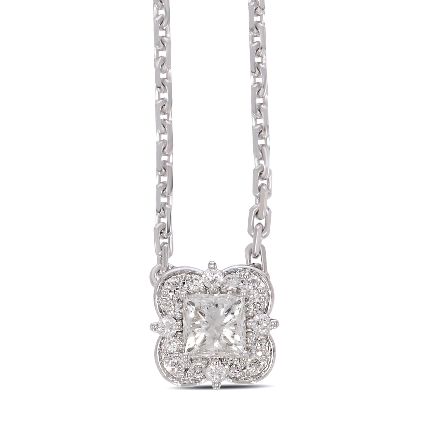 Graceful and radiant, the Regalia Princess Pendant features a striking princess-cut natural diamond at its heart, framed by a soft quatrefoil halo of pavé-set round diamonds. Crafted in lustrous 18kt white gold, the pendant exudes regal sophistication with a touch of floral charm—perfect for both elegant evenings and timeless daily wear.