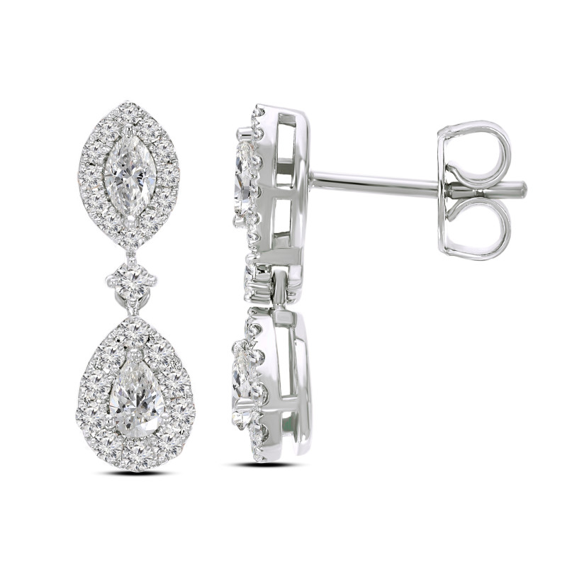 Drop earrings featuring the same marquise-shaped upper section with a halo of round diamonds, connected to a pear-shaped lower drop mirroring the pendant. Each earring would include a central marquise-cut diamond on top and a pear-cut diamond below, both surrounded by double halos of pavé-set diamonds. A small round diamond link between the two sections adds articulation and harmony with the pendant.