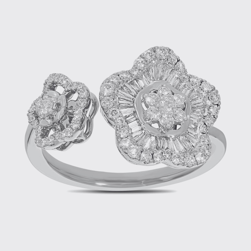 This enchanting 18kt gold ring features a duo of blooming floral motifs, delicately outlined with brilliant natural diamonds. The intricate dual-layer petal design combines round and baguette diamonds, creating a captivating sparkle and elegant contrast. A perfect blend of femininity and sophistication, this open-top bangle is a timeless expression of refined.